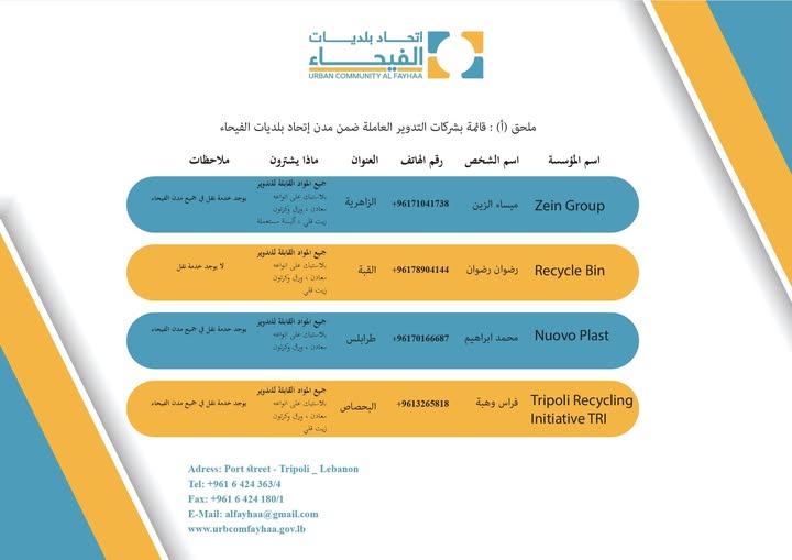 قائمة بأسماء شركات التدوير العاملة ضمن اتحاد بلديات الفيحاء